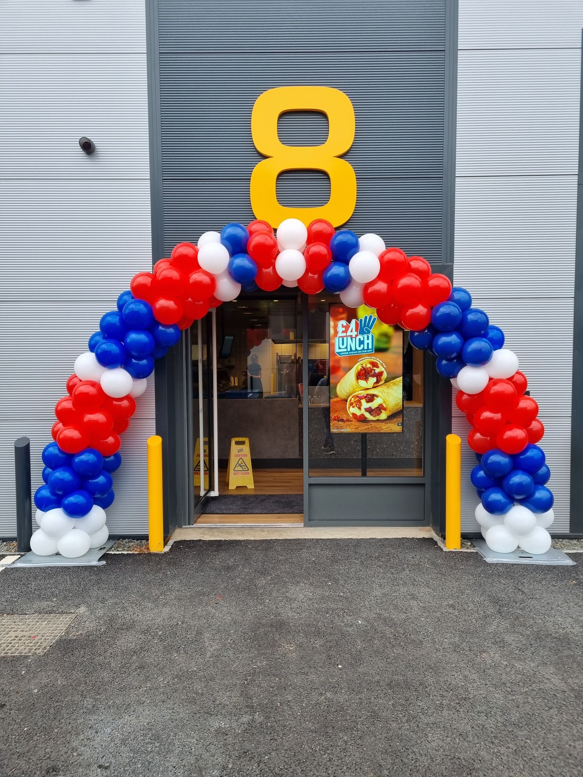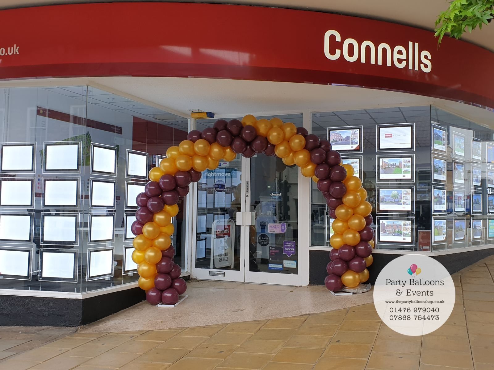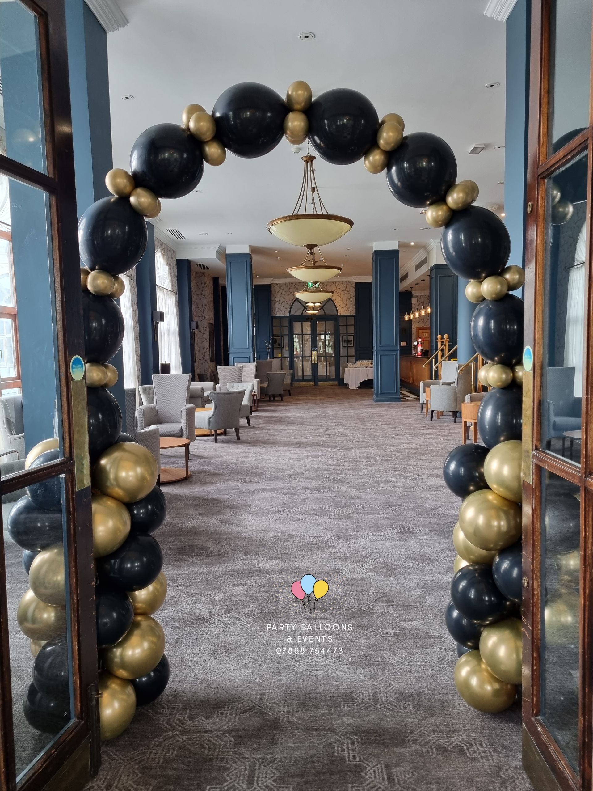 A full balloon arch stretches from one side to the other (floor to floor).